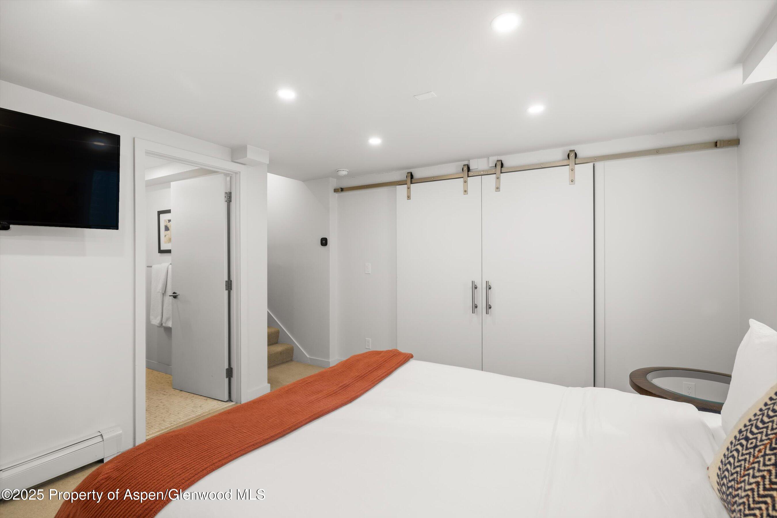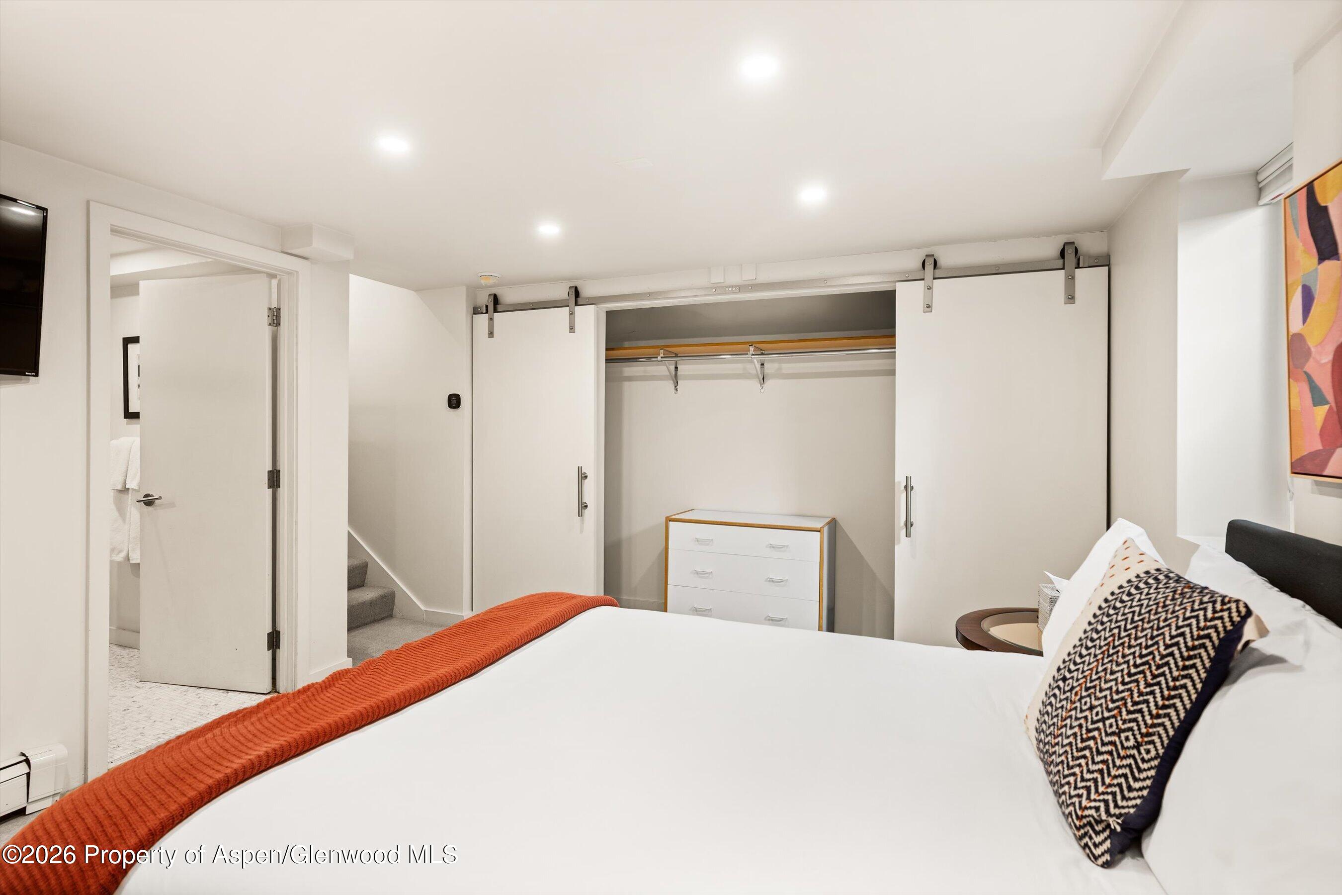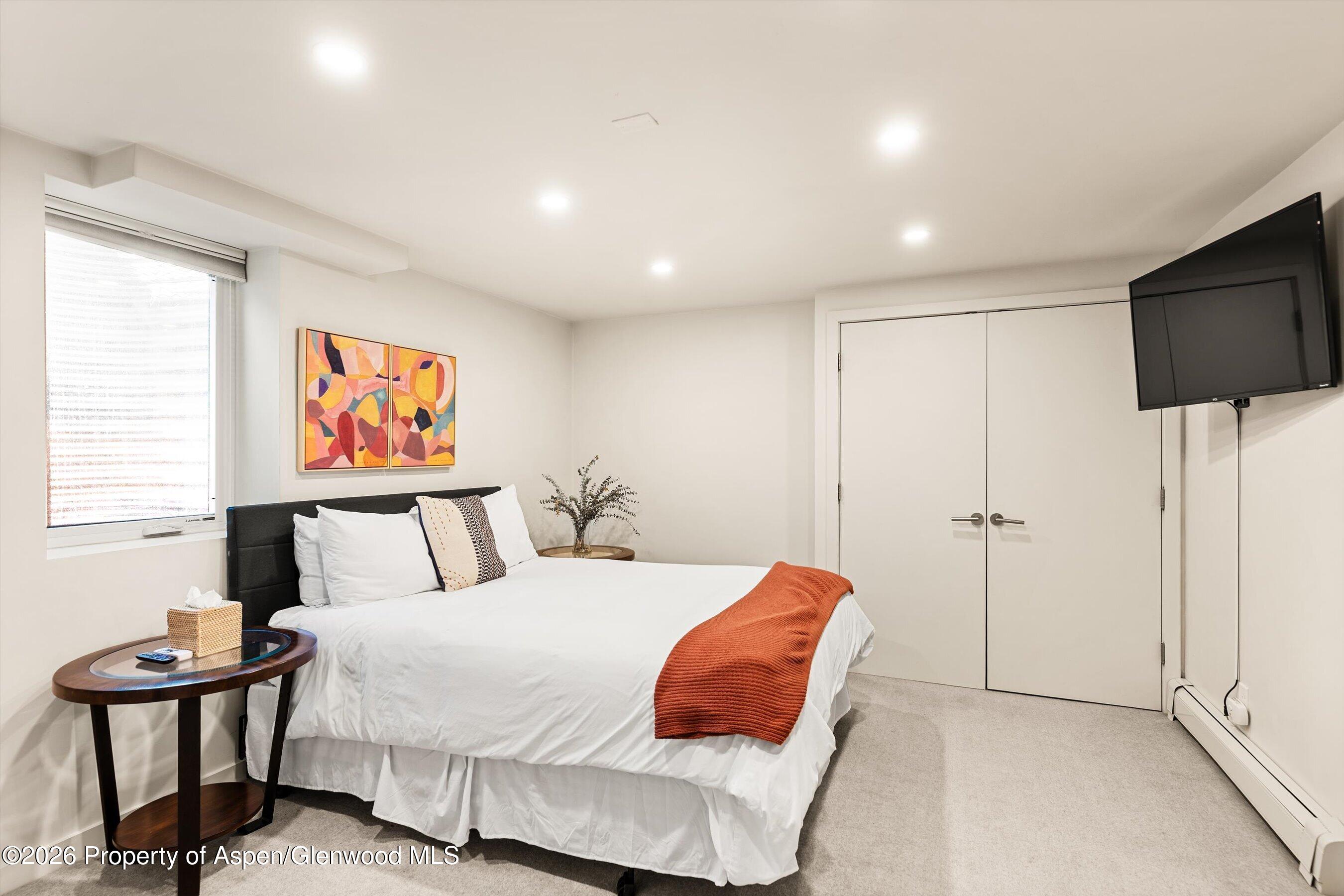 The spacious primary suite features breathtaking Aspen Mountain views from the upper level, off-street parking, dual walk-in closets, and a luxurious en suite bathroom with a double vanity.