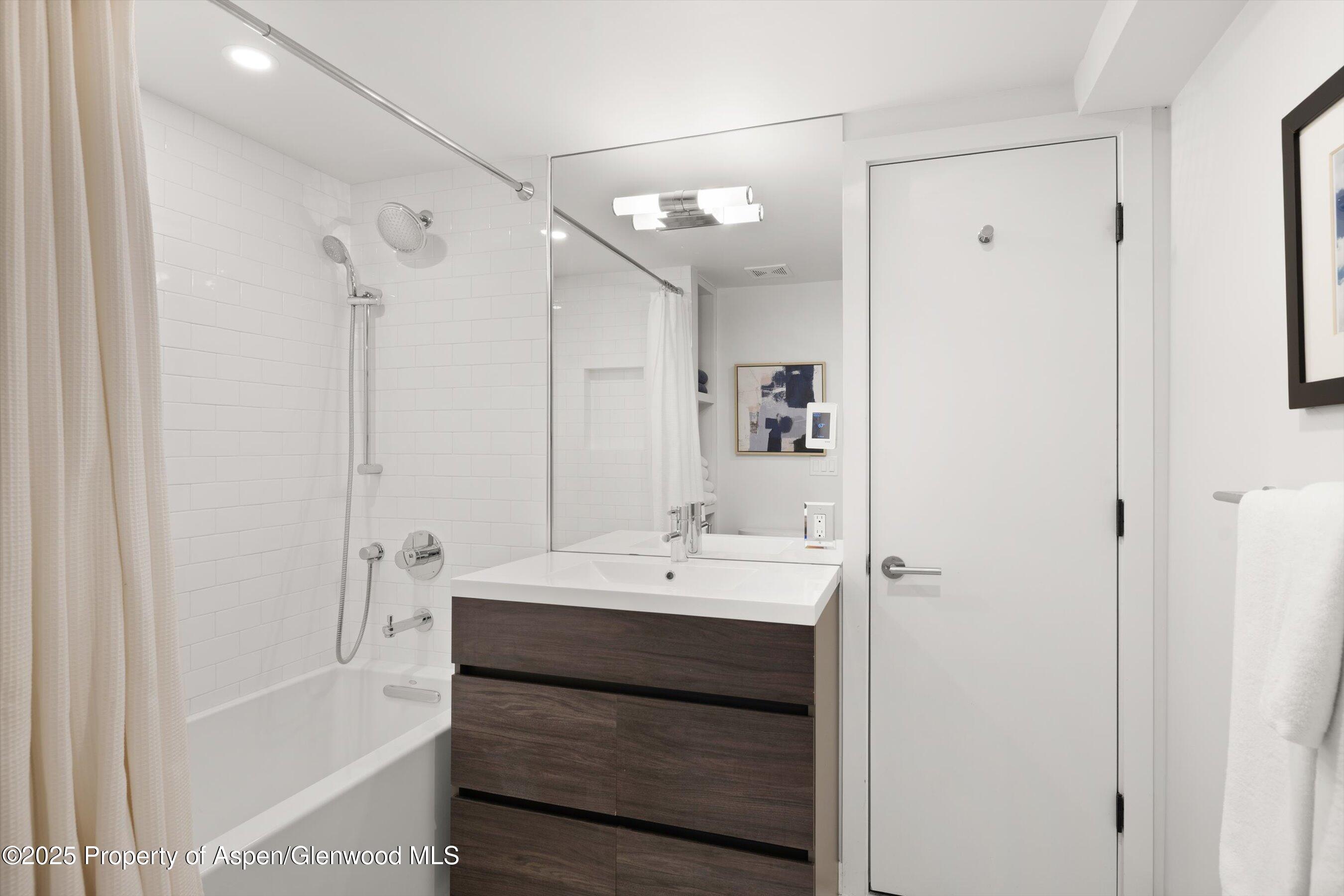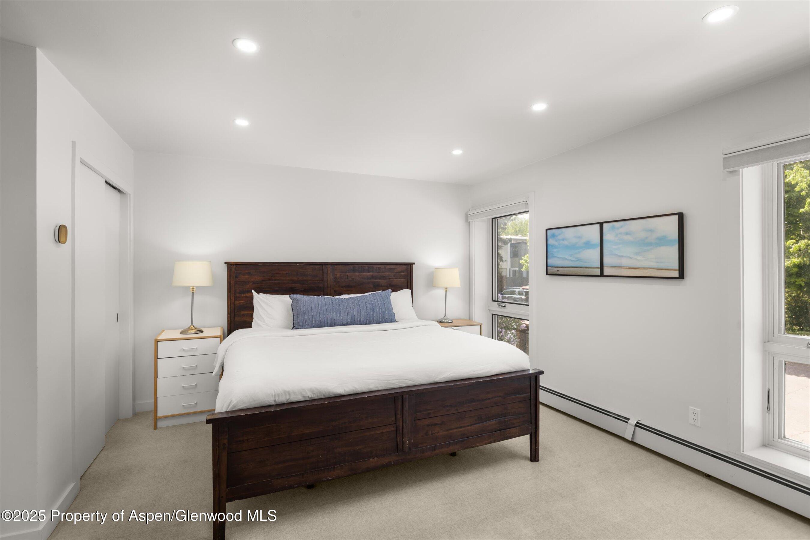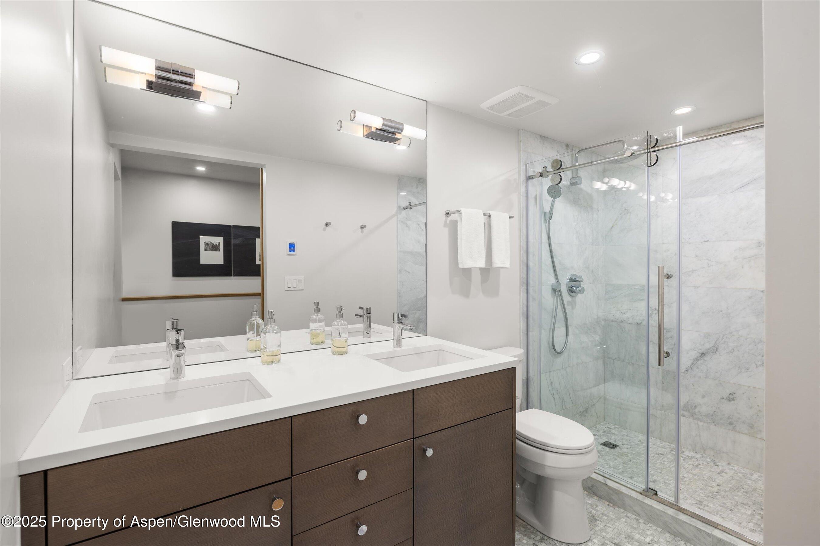 The spacious primary suite features breathtaking Aspen Mountain views from the upper level, off-street parking, dual walk-in closets, and a luxurious en suite bathroom with a double vanity.
