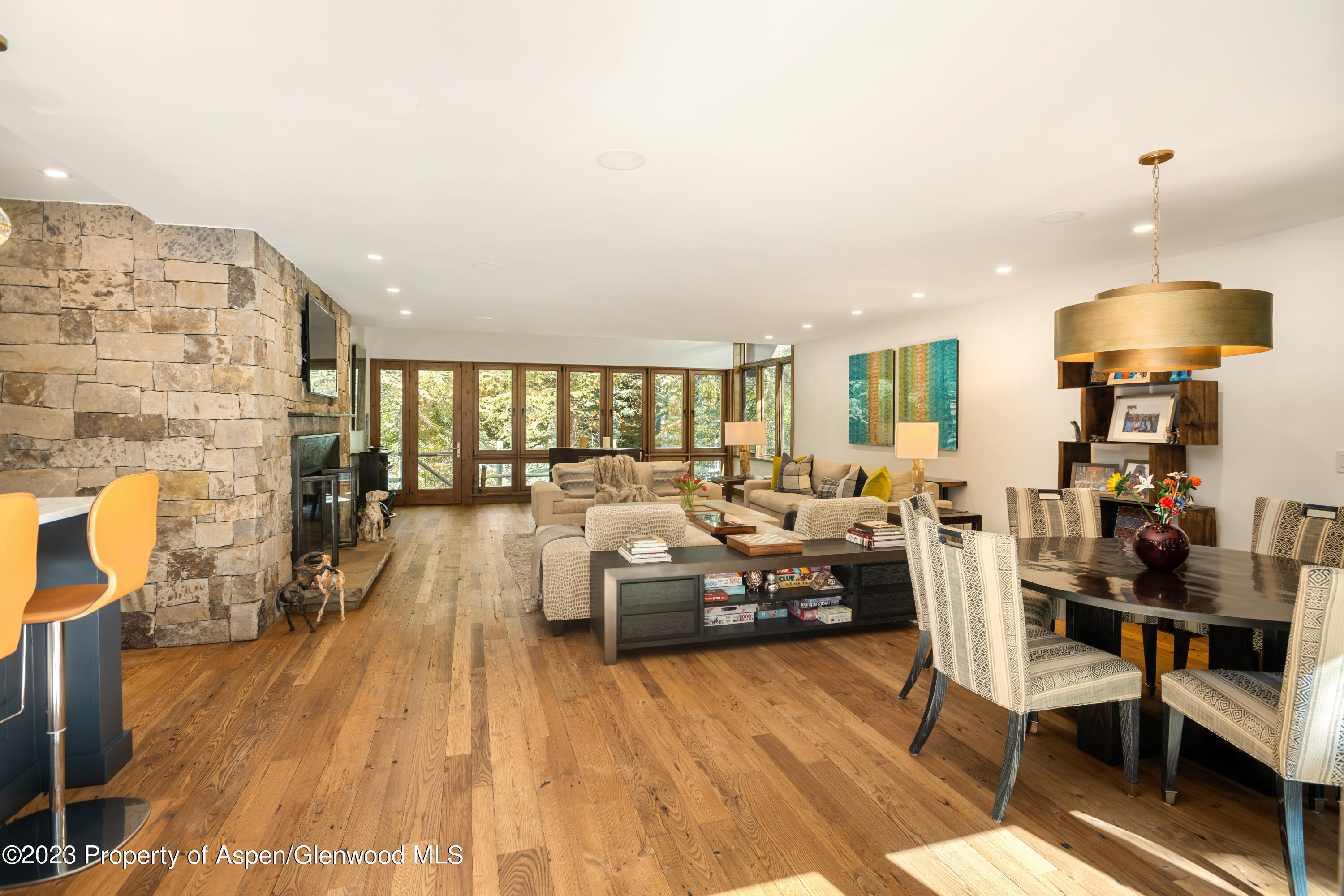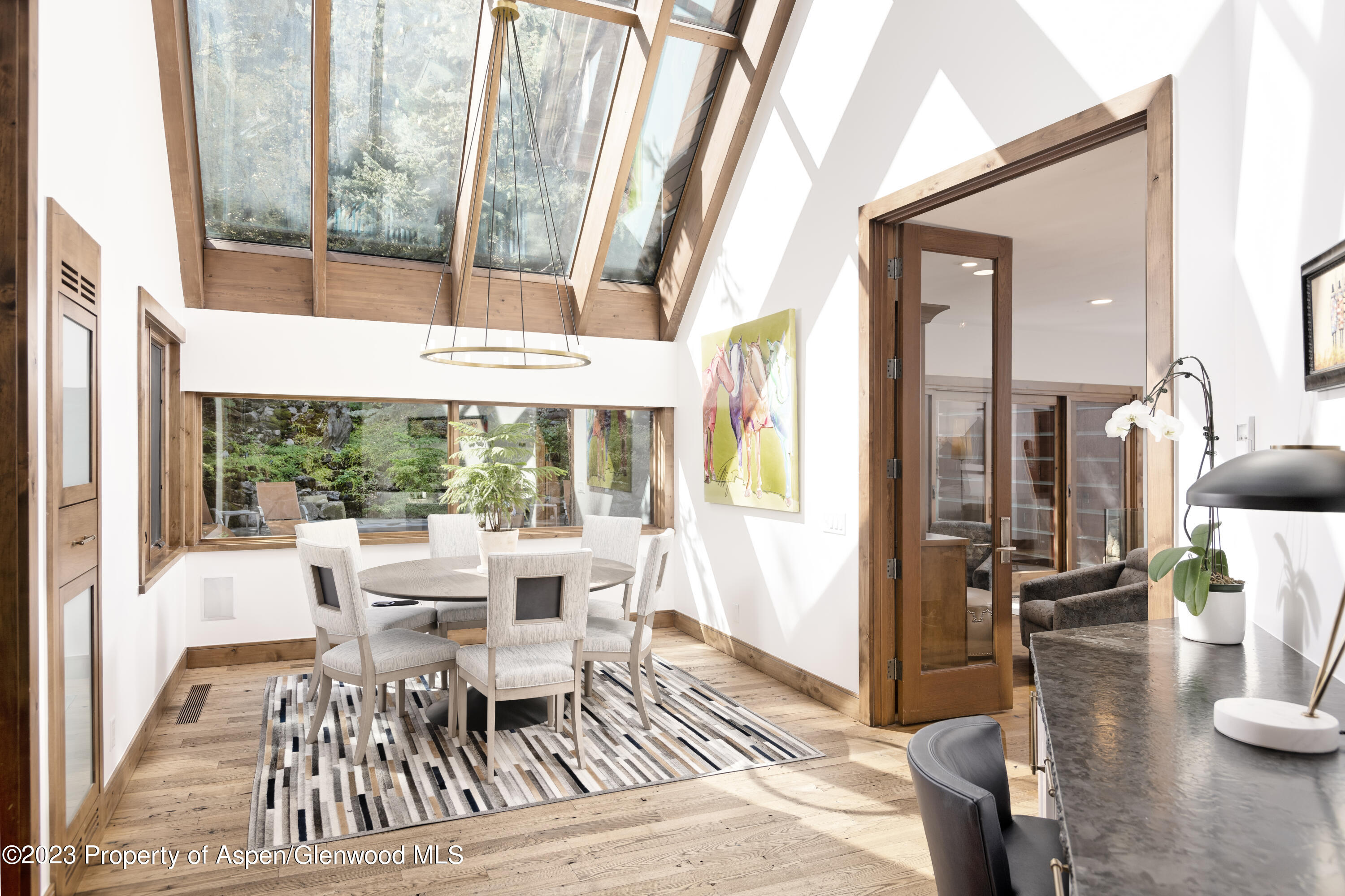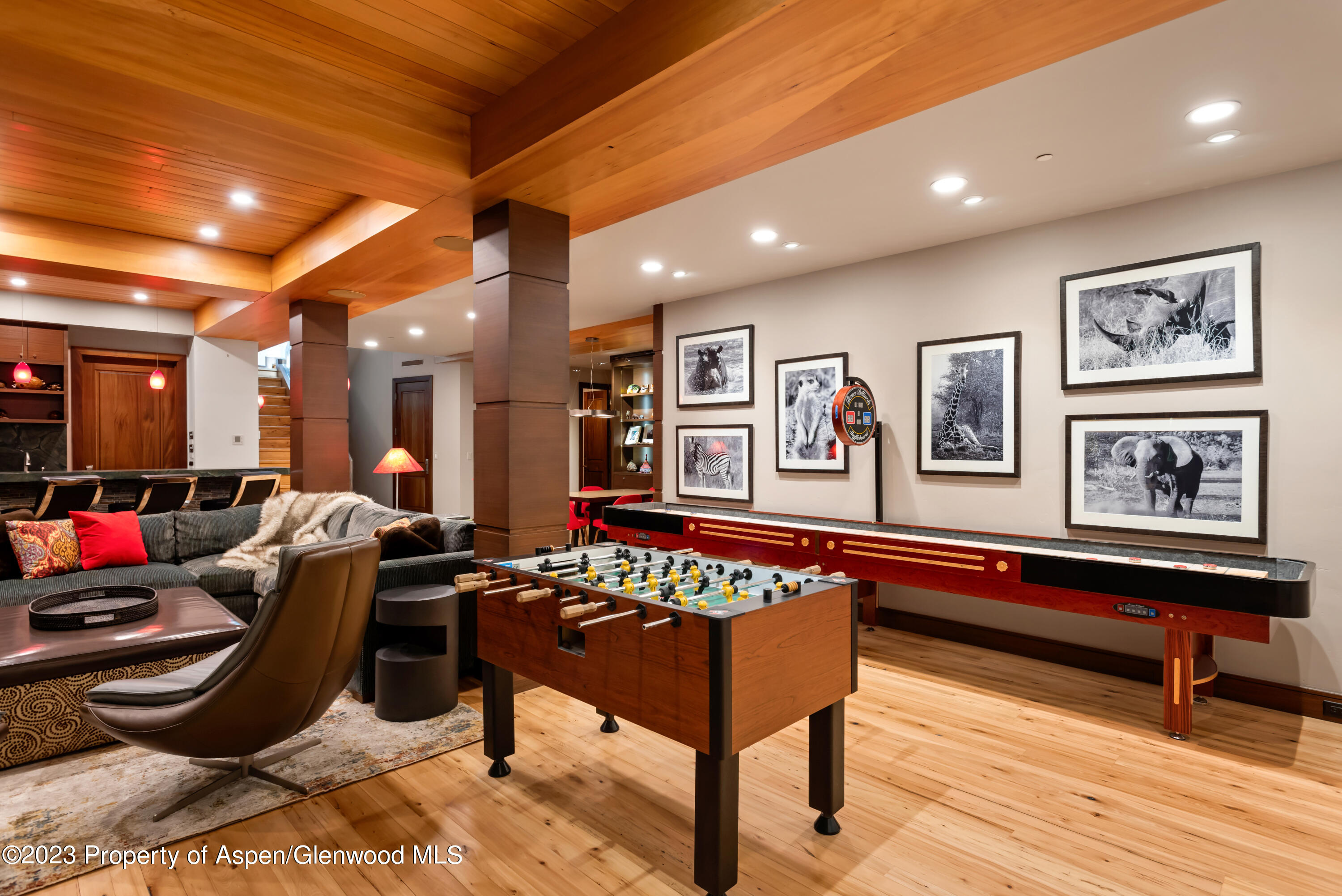 This private enclave is nestled at the base of Aspen Mountain with true ski-in access and easy walk out access right onto Ajax. The sprawling main level offers abundant natural light from skylights and floor-to-ceiling sliders that lead out to a fenced-in side yard and separately to a fenced in backyard with oversized patio. A tranquil, private pond and stream run through the backyard all year round. Additional outdoor features include an in-ground hot tub, fire pit, grill, and a path down to a shared, flat yard and swing set, all enveloped by mature trees and landscaping. Inside the open-living floor plan you can cozy up by the two-sided fireplace, cook and entertain in the gourmet kitchen, or relax in the second, private den. Upstairs you will find a private Primary bedroom wing with large, walk-in closet, his and hers bathrooms complete with a steam shower and soaking tub, in closet W/D and private outdoor patio with gondola views! Three additional bedroom suites and one lofted bedroom suite situated up its own private spiral staircase. On the lowest level you will find the 6th bedroom suite, a gym, wet bar, shuffleboard, foosball and entertainment/ media area, perfect for entertaining year round. 1 Bay in a 2-car garage included. 2nd bay may be negotiated at the time of an offer. *This property also features a separate guest house with 2 additional bedrooms and en suite bathrooms to total 8 Bedrooms and sleeping up to 16 people. Guest house is not included in pricing and may be available for parts of the year. Please inquire directly with desired dates for guest house rates.
